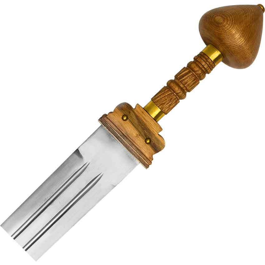 Next, the sword continues with a brass and wood grip. There are brass sections on the ends of the grip. The grip has multiple ridges and grooves, giving it a detailed look. The handle ends with a pommel with the shape of an upside-down top. It has a brass end cap. Finally, the sword comes with a wooden scabbard. Red leather wraps around the leather. The scabbard has brass fittings, including a loop for hanging the scabbard from a belt, not included. There is also a round cap at the tip of the scabbard. It features an engraved design. Bring this sword to a historical reenactment or add it your Roman sword collection. It looks great on display.