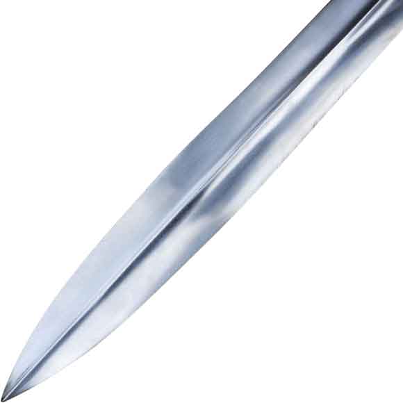 The blunted double-edged blade is shaped like a leaf, reminiscent of its historical inspiration. The U-shaped guard is made of bronze and ensures your grip doesn’t slip onto the blade. The rest of the handle is also made of bronze, riveted to the tang. At the bottom, the round, dish-shaped pommel secures your grip and adds historically authentic style to the design. This pommel has a button.