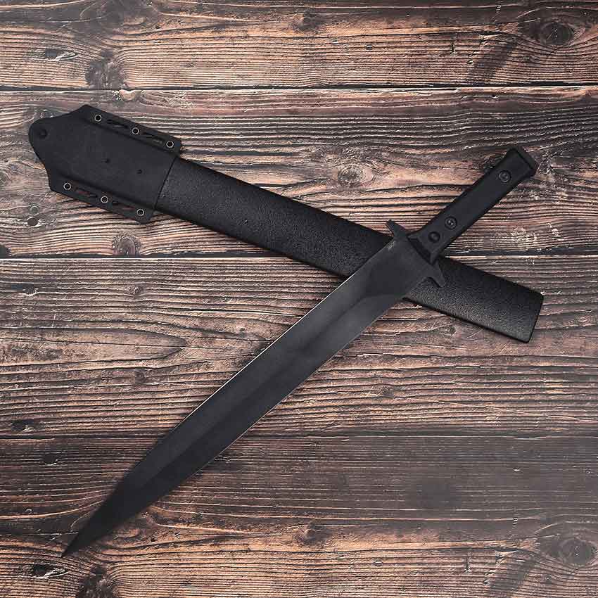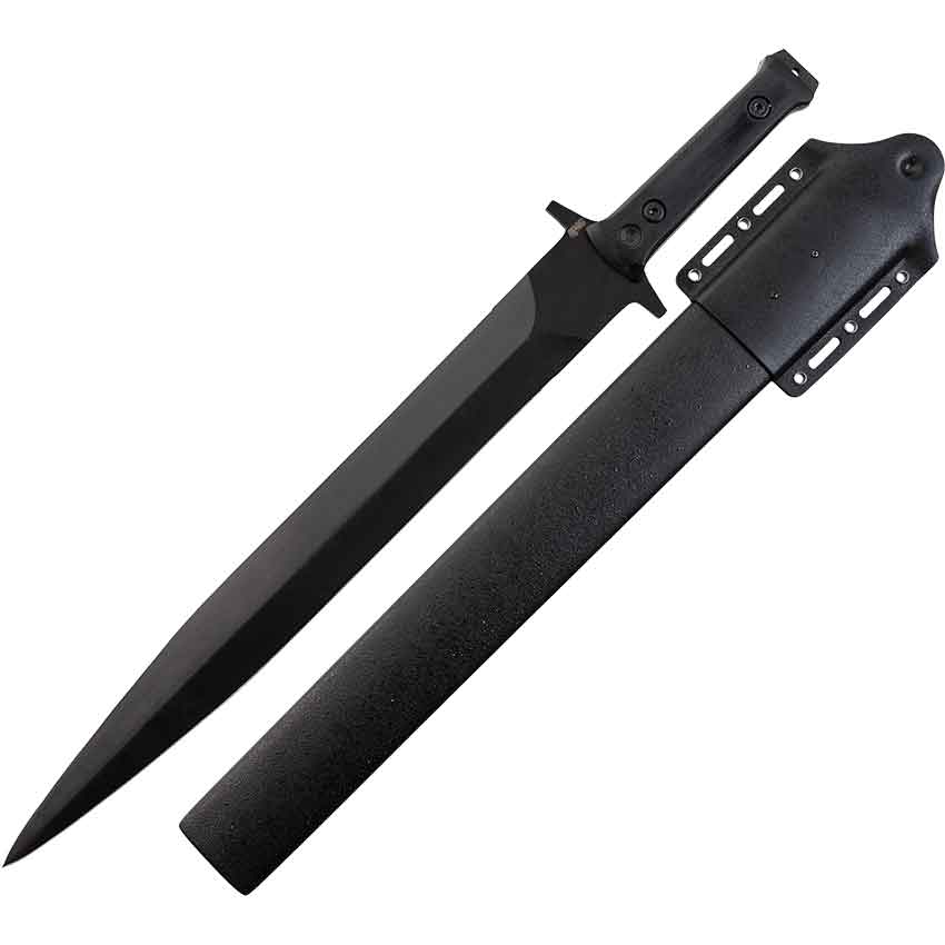 No matter if you are preparing for a zombie invasion or the end of the world, the APOC Brutus Tactical Sword makes a great sword to have on hand. Made from 9260 spring steel, this sword has a double-edged blade. Designed by Angus Trim, the black blade has a spearpoint tip. Its short ricasso acts as a crossguard. The blade design is great for cutting and thrusting. The full tang sword continues with a black, fiberglass handle. That G10 handle has straight sides along the grip and it flares out slightly at the end. Screws secure the grip in place. Finally, the APOC Brutus Tactical Sword comes with a black, Molle compatible sheath. This fully functional sword is a wonderful weapon to wield or add to a blade collection.