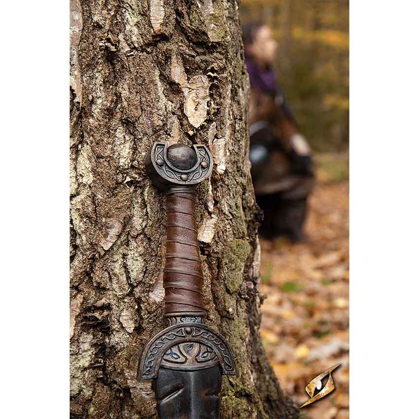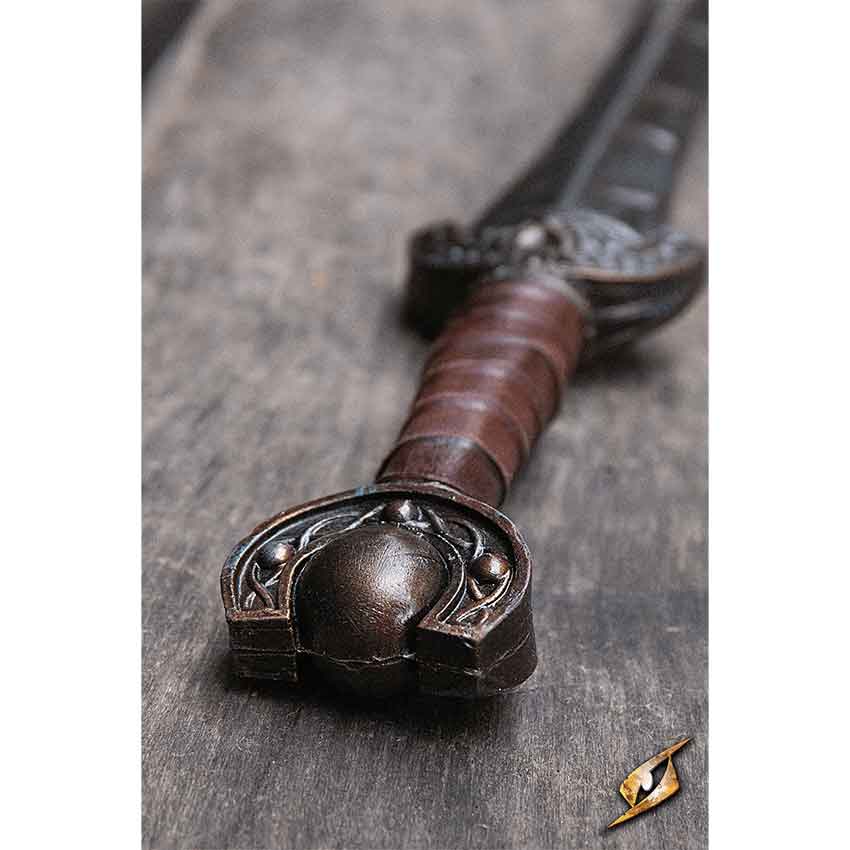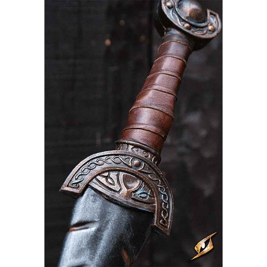 No matter how many enemies you face, the Battleworn Celtic Leaf LARP Short Sword still remains at your side. Your trusty weapon gets the job done. This Celtic sword has a fiberglass rod core with a Kevlar core tip. Around this is an EVA foam blade that is durable and shred resistant. Latex coats the blade. This blade curves inward, then outward towards the tip. Notches and nicks adorn the blade as well as dark spots to mimic rusts and stains. In between the polyurethane foam handle and EVA foam blade is the crossguard. The guard has a U-shape, just like the pommel. They point in opposite directions, typical of Celtic war swords. Also, they have a copper color with a verdigris style finish. Knotwork adorns both the pommel and handguard. Between them rests the grip. This grip resembles wrapped leather. The Battleworn Celtic Leaf LARP Short Sword is the perfect blade for all sorts of settings and characters. It is great for cosplay events and theatrical productions.
