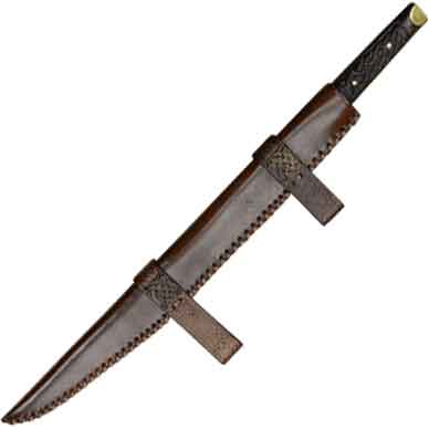 This seax replica comes with a brown stitched leather sheath. When sheathed, the stitching ensures the blade remains secure. This sheath has two asymmetrical belt loops so it holds the Anglo-Saxon dagger replica at a slight angle, making sure it doesn’t fall out. These loops are embossed with intricate shield knots.
