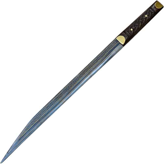 The unsharpened, single-edged blade has intricate 18k gold runes inscribed along its spine. These runes are inscribed by hand in the Futhark style. A fuller in the middle has gold trim. On the back of the blade, the gold and silver design is a geometric dotted pattern. Like its historical inspiration, the dark brown wooden handle is carved by hand to look like knotwork. The knotwork handle has two gold rivets securing it to the tang. This knotwork gives you a unique tactile experience. The guard and pommel are gold-inlaid facets.