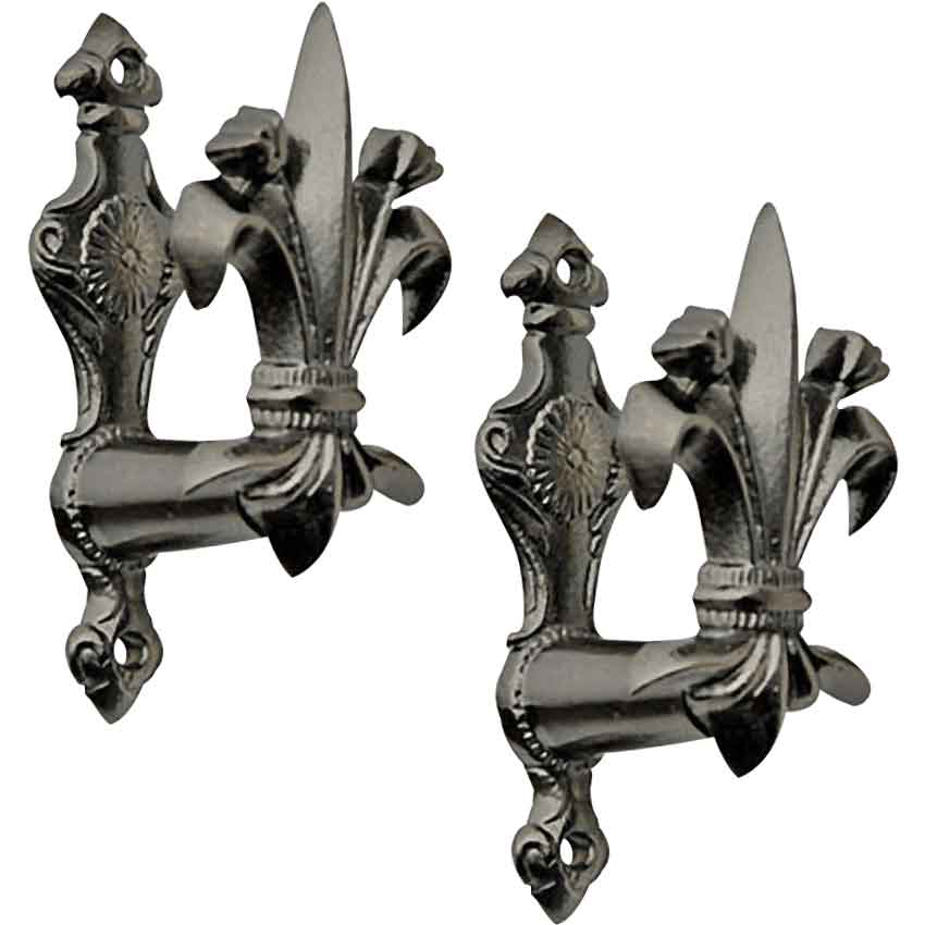 Some weapons deserve a bit of noble styling when it comes to their display, and this Fleur de Lis Expandable Sword Hanger provides just that. Turn your sword into an eye-catching home accent with this set of Renaissance sword hangers. Sold as a matched pair, these handsome hangers are made from cast metal and feature a darkened silver finish. Adorned with the fleur-de-lis, they are the very picture of royal symbolism. They are adjustable, so they can be used to hold a wide variety of weapons. Slightly extended, they can accommodate axes, maces, pistols, and rifles as well as swords. The spring-loaded release will keep the weapon it holds securely held against the wall. These stylish wall hangers come with the hardware needed to install them with ease. The Fleur de Lis Expandable Sword Hanger is worthy of Excalibur, Joyeuse, and Durandal, Now you can transform one of your own weapons into a likewise legendary decoration on your wall.