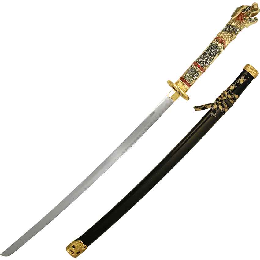 The might and power of the great dragon has always impressed you. Capture the strength of that mythical creature with the Golden Dragon Samurai Sword. Made from stainless steel, this decorative katana features the curved blade typical of Japanese swords. The blade ends at a gold-colored tsuba. A dragon design adorns this tsuba. The dragon motif continues with the colorful and intricately detailed handle. This handle features small, stylized scenes and ends in a dragon head for a pommel. Finally, this decorative sword comes with a black scabbard. The Golden Dragon Samurai Sword adds a wonderful touch to any decor. Display it in your home or office.