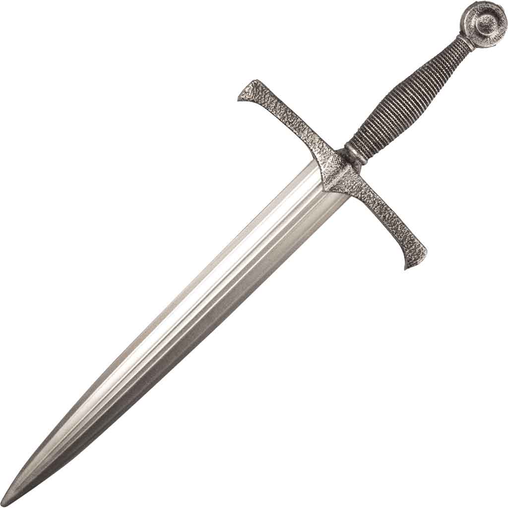 Crafted from polyurethane foam, this Mytholon dagger is designed for epic LARP combat. The latex-free foam construction ensures you can enjoy the thrill of combat for years to come. This medieval LARP dagger is one-handed for swift strikes and mobility. Like real medieval daggers, the Hartmut dagger is good for slashing and piercing attacks. This Mytholon dagger has a detailed, knightly appearance. The silvery, double-edged blade has a narrow double fuller. This blade is shred-resistant, highly flexible, and durable, standing up to full-contact blows in LARP.