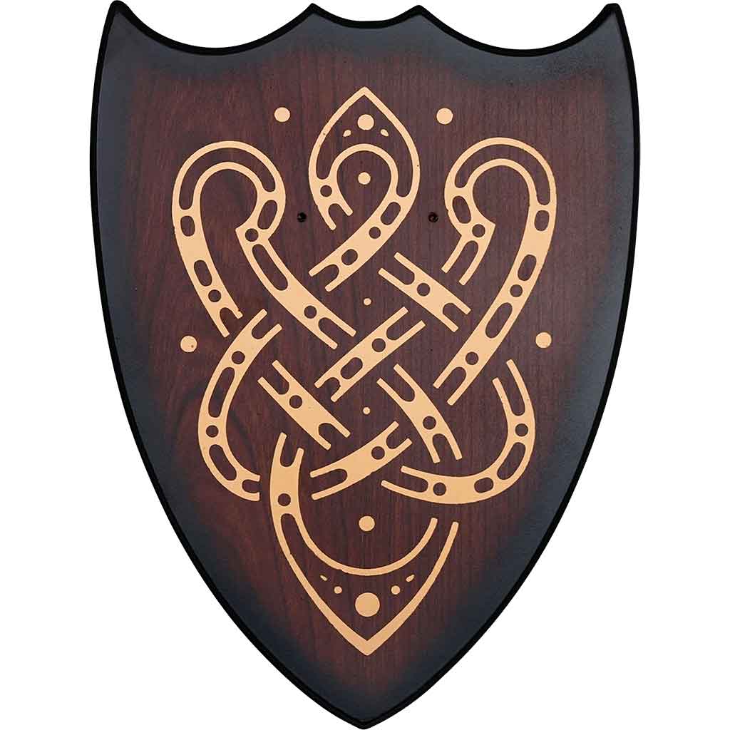 This long Viking sword comes with a wooden display plaque. This display plaque is in the shape of a medieval shield with concave notches at the top. Emblazoned on the plaque are interlocking swirls of golden knotwork for regal style. This plaque holds the sword up by the hilt, point down, and shows it off with Asgardian pride in your decor.