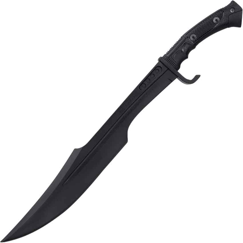 Wish you could be as mighty as King Leonidas? You will need to practice your sword skills using the Honshu Practice Spartan Sword. Made from polypropylene, the training sword has a curved edge on the blade with a point along the spine. The blade then narrows into a straight section near the base. A fuller runs down the length of the blade. In addition, there are four circular cutouts adorning the blade between the spine and fuller.