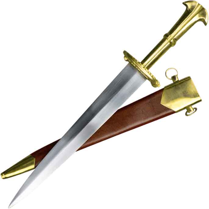 This arming dagger comes with a leather scabbard. The brown scabbard has a brass chape and throat. The throat has a pair of hanging rings, perfect for adding the dagger to a buckle belt or ring belt, sold separately. This German dagger makes a great sidearm for any Landsknecht warrior or medieval mercenary.