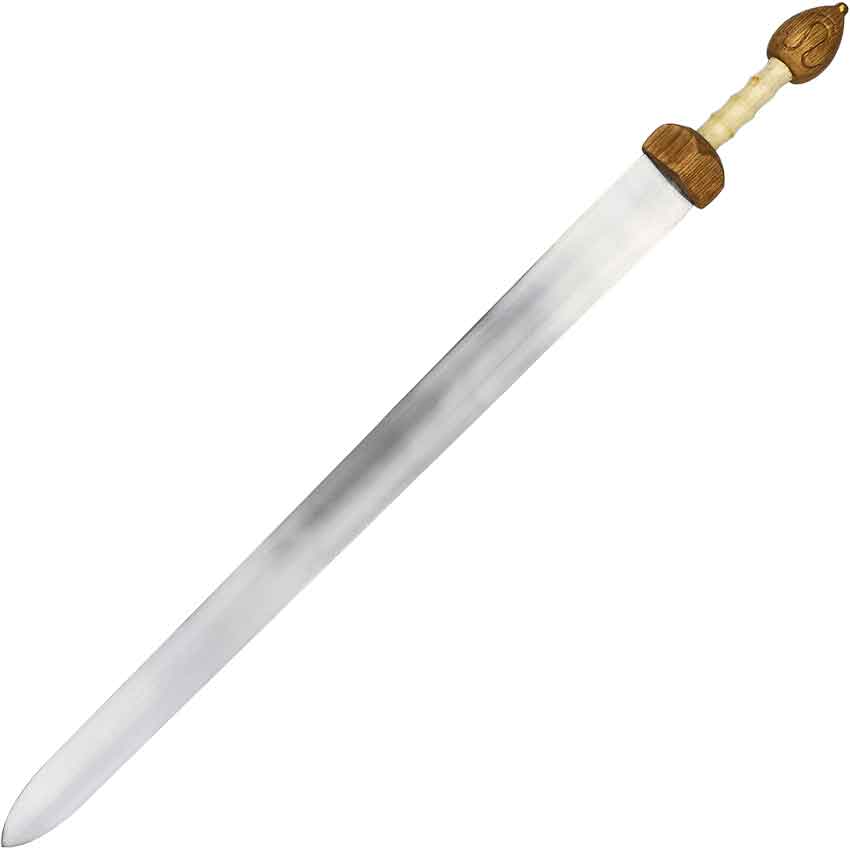 The Late Roman Spatha Sword is equally great for those warriors who ride into battle or command the Roman Empire from a seat in the Senate. Made from EN45 high carbon steel, this sword has a flat, double-edged blade. Based on a historical example, this sword has a longer blade design which was popular for mounted cavalry. This sword continues with a short crossguard. The crossguard is rounded on the grip side. Then, the hilt continues with a ridged bone grip before ending with a rounded pommel. A carved design adorns the pommel. Finally, the sword comes with a wooden scabbard. Red leather wraps around the leather. The scabbard has brass fittings, including a loop for hanging the scabbard from a belt, not included. Bring this sword to a historical reenactment or add it your Roman sword collection. It looks great on display.