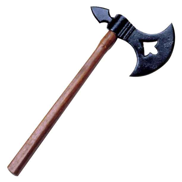The Medieval Axe features a hardwood handle with a decorative carbon steel black coated blade. The traditional style and classic elegance creates the perfect addition to your collection. The Medieval Axe has an overall length of 15 inches and a 4.75 inch edge. This medieval axe is not designed to be thrown but makes a great display piece or stage prop.