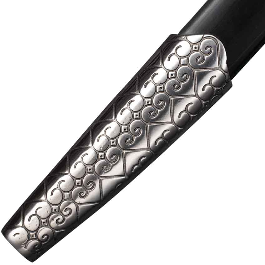 Inspired by ancient Middle Eastern blades, the Scimitar Sword by Cold Steel is a handsome blade for collectors and modern warriors. The Persian sword features a wide, deep fuller and a curve that facilitates the devastating draw cut. Made from expertly heat-treated 1055 high carbon steel, the functional scimitar is perfectly balanced and hand-honed to a keen edge. The large, S-shaped guard and tang are intricately engraved, and the dark rosewood handle scales are securely held in place with three sturdy brass pins. The bulbous pommel features a brass inlaid hole for a cord, lanyard, or sash. This collectible scimitar includes a thick, hand-stitched leather scabbard with an etched steel throat, chape, and carrying rings.