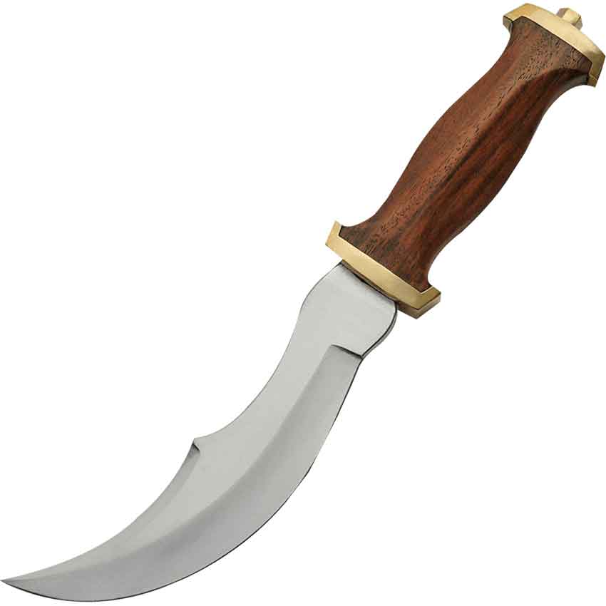 For the soul who enjoys the excitement and wealth found while sailing with the Brethren of the Coast, a good dagger proves its value. The Pirate Scimitar Dagger guarantees the seafaring adventurer stands strong, ready for combat. Its fantastic design, inspired by pirate lore, reveals a wide blade that curves upwards. Its partial double-edge stops at a notch mid-spine. Brass trim decorates the guard and pommel of the wooden h-shaped handle. Admire the beauty of this fantasy dagger while carrying it close with the included leather sheath. Its holder features a loop for easy attachment to your belt, while two fasteners keep the dagger safely in place.