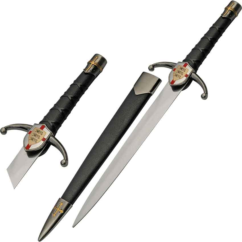 Next, the dagger continues with a curved crossguard. The crossguard curves towards the blade. In the center, there is a shield shape with a crest similar to the one of Richard the Lionheart. It features a triple lion design. The hilt continues with a black grip. The zinc alloy handle features multiple raised crossed lines. Then, the hilt ends with a helmet-like pommel. It features a brass-colored cross. Finally, this dagger comes with a matching black scabbard. The scabbard has silver-colored fittings. A brass-colored cross adorns the lower fitting. You can add this Royal Arms Guard dagger to your medieval outfit or your decor. It displays wonderfully in any home or office.