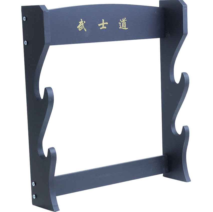 Warriors and wielders of swords should have a proper place to lay their blades. Use the Samurai Two Sword Wall Rack to store your swords. Made from wood, this black wall stand has two pairs of slots for holding swords. Each slot has a rounded, wave-like shape. There are two bars across the back that hold the sides together. This wall rack makes a great addition to a wall in your home, office, or practice space.