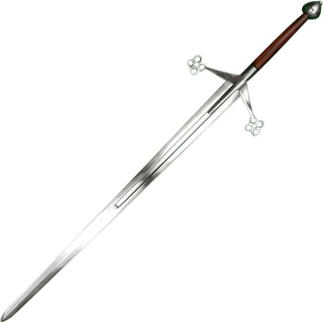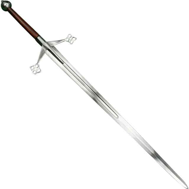 Starting with the unsharpened double-edged blade, it has a wide fuller from the forte down to the terzo. The forte is the shorter, stronger side of the blade and the terzo is the middle. The angled steel crossguard ends in quatrefoil quillons reminiscent of historical claymore swords. The langets on the crossguard extend over the fuller. The rest of the handle is brown hardwood. The peened nut-shaped pommel at the bottom keeps your grip from slipping off the blade.
