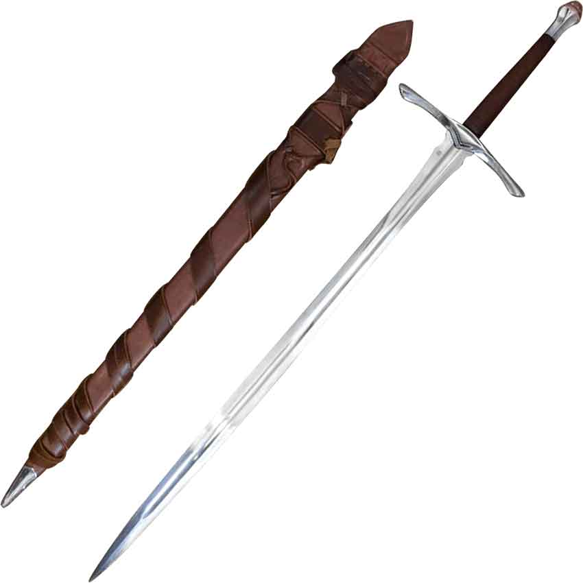With a name like The Sage Sword with Scabbard and Belt, you can be forgiven for expecting a fragile blade and not this warriors sword. Crafted with Elvish style in mind, this sword is the epitome of fantasy style made into a battle ready blade. Designed around Tolkien lore, this sword is made after the fashion of the elves and modeled after the legendary Foe-Hammer, Glamdring. The sword is forged from dual hardened 5160 high carbon steel. The blade also features a fuller down its length. Broad quillons make up the guard that curves gently towards the blade, and the grip of the hilt is made of wood secured around a full-length tang and wrapped in brown leather for an effective hold. The uniquely shaped scent stopper pommel, with its flared edges, is hot peened to the tang for added durability. The sword comes complete with a matching leather-wrapped wood scabbard with attached belt. The Sage Sword With Scabbard and Belt is the weapon of a traveling lore-seeker who depends on clever wits and martial skill to see him through the great dangers on the road. And this battle-ready sword will indeed allow any warrior to cut down any foe that dares face him or her in battle.