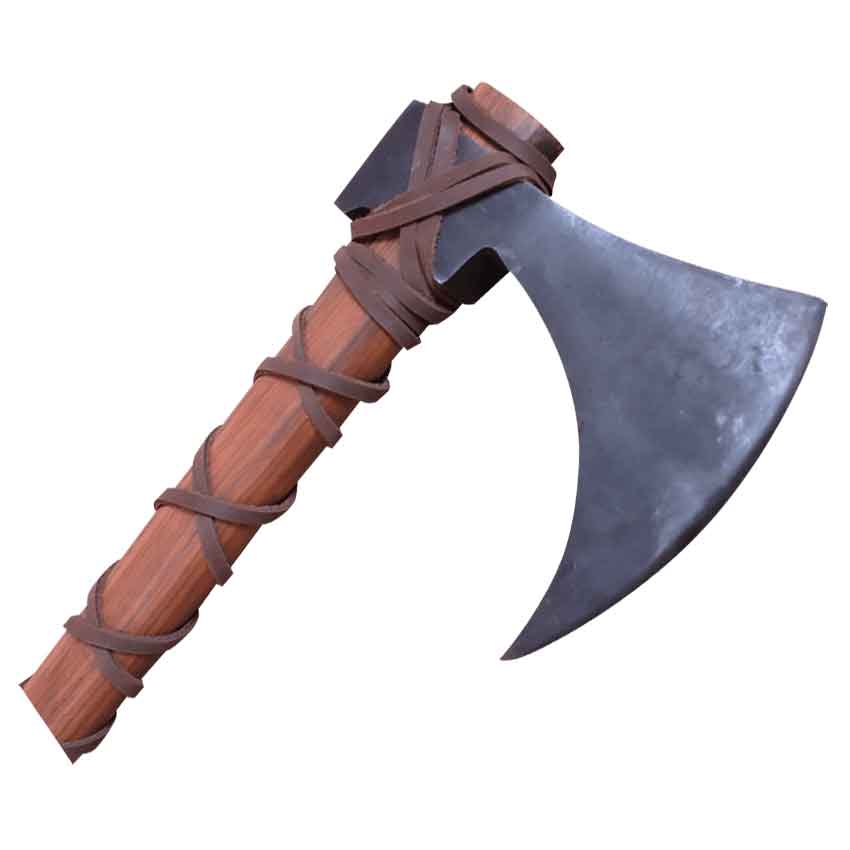 The axe head is mounted on a wood haft that is wrapped with leather ties, which both help secure the axe-head and provide a secure grip all along the hafts length. Its size is such that this axe serves perfectly as either a one-handed battle axe or a two-handed weapon. Either way, this Viking Axe features a lot of potential, both as a historic artifact to have hanging on your wall and as a weapon for you to wield at the training ground and on the field of battle.