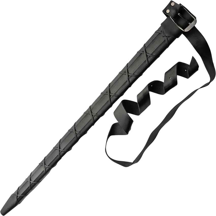 Moving onto the blunted, double-edged blade, it has a distinct fuller running down its length. To safely store this blade, insert it into the black leather scabbard. The scabbard has crossed ties down the length and an adjustable belt strap at the top. The belt is attached to the scabbard so you can tie it around your waist.