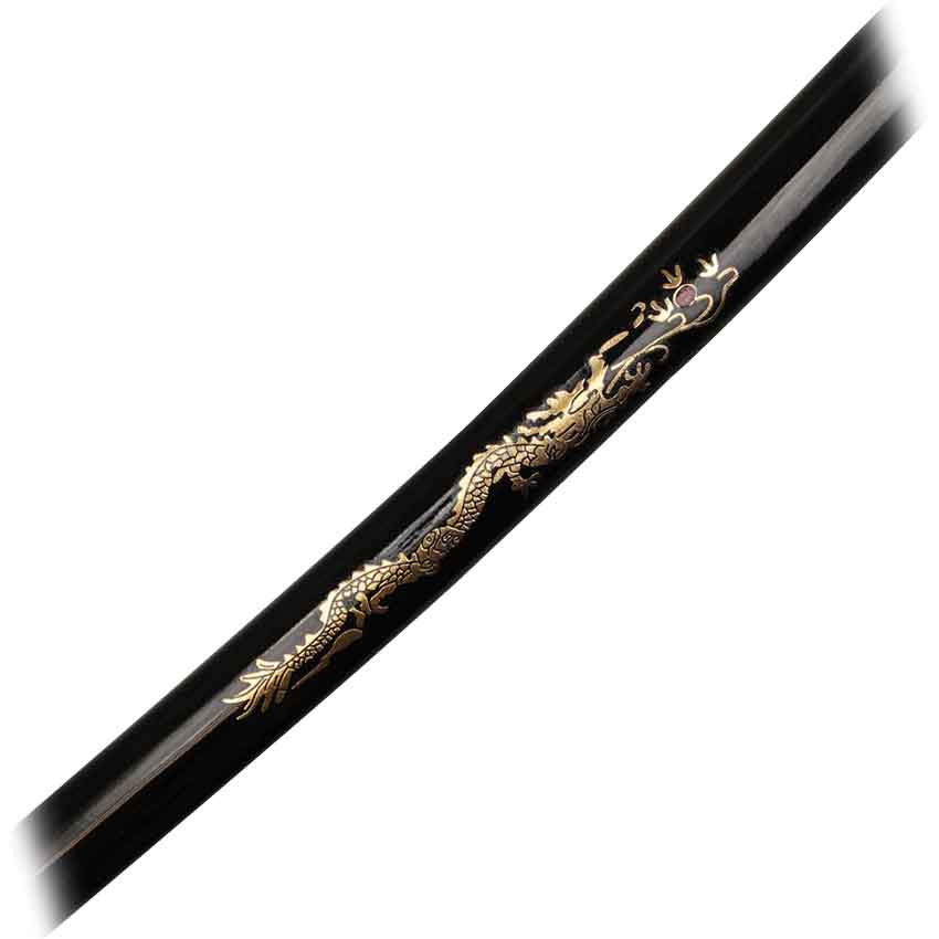 With the cunning and strength of a dragon, you outwit and defeat your opponents. You emerge victorious with the Warrior Golden Dragon Saya Katana. Made from 1045 carbon steel, this blade features the traditional curved shape found on many Japanese swords. A fuller runs down the length of the blade. The blade enters the handle at a dark colored tsuba. A warrior adorns the tsuba. Next, the sword features a black, fabric-wrapped handle. A matching black scabbard accompanies the sword. A gold-colored dragon adorns the hard wood scabbard. Finally, the katana comes with a sword bag and certificate of authenticity. This golden dragon katana looks great on the battlefield and on display in your home.