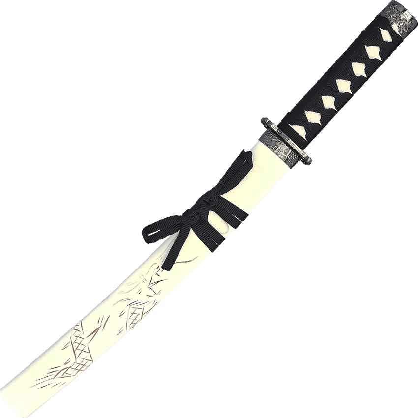 The dragon clans have honored you by granting you the White Carved Dragon Sword Set. You display it proudly to show your connection to the dragons. Made from carbon steel, this sword set includes three swords of different lengths. These are a katana, wakizashi, and a tanto. All three swords feature a curved blade typical of Japanese swords as well as black, fabric-wrapped handles. They come with scabbards. Carved dragons adorn the white scabbards. Finally, the swords come with a display stand. This dragon sword set makes a great addition to any sword collection or decor.