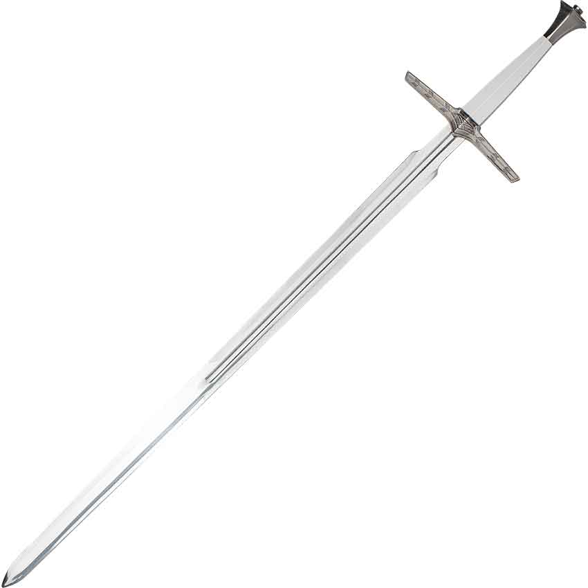 If you wish to take down all kinds of monsters like the legendary white wolf, make sure that you check out the White Wolf’s Silver Sword. Made from stainless steel, this sword features a design inspired by the TV show. This medieval fantasy sword has a double-edged blade. The sword continues with its distinctive crossguard. The arms of the silver-colored crossguard angle slightly towards the blade. Three sections of arrow-like lines adorn the arms and point towards the center. The center features an X-shape and has a point at the bottom. The point faces the blade.