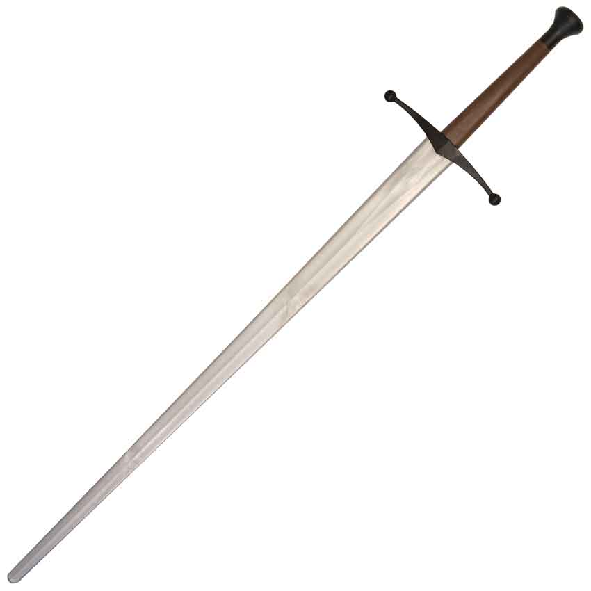 The ball-shaped finials on the guard and the rounded pommel are designed for sparring safety. They allow virtually no pointed or sharp edges that could catch, pierce, or puncture. Meanwhile, the grip is made from a rubber-like material that is designed to absorb the impact of strikes. It also provides a tight fit to the tang.